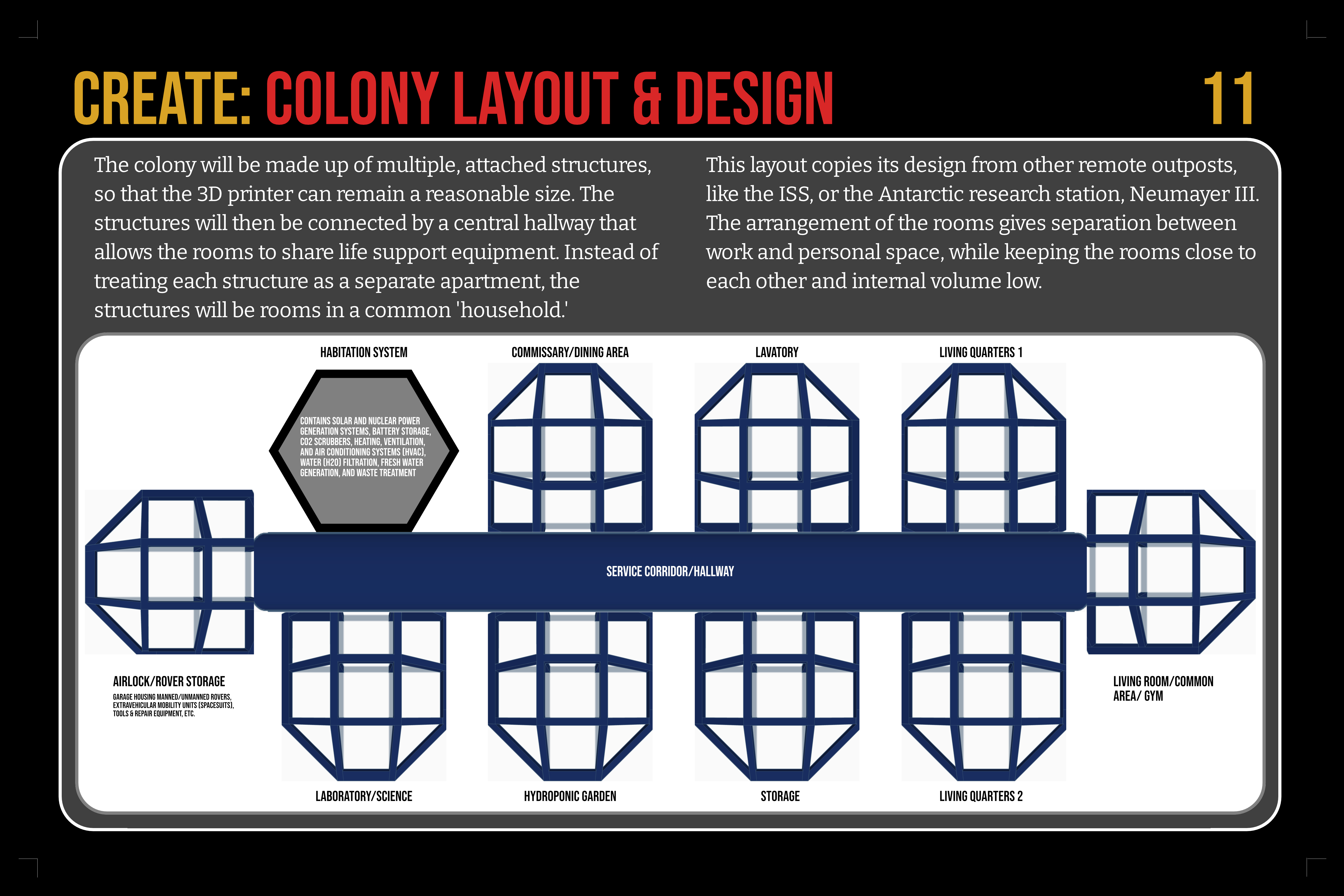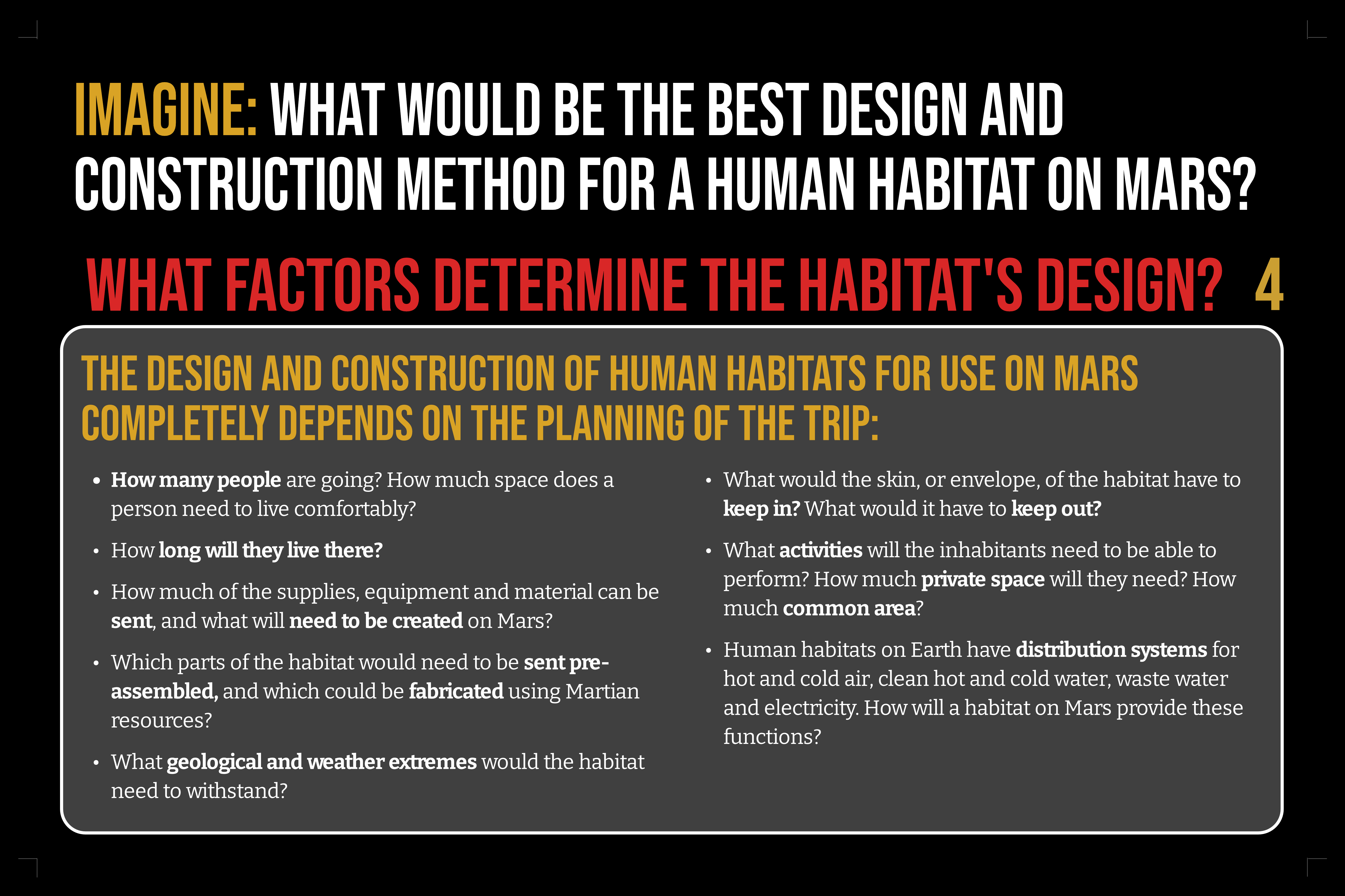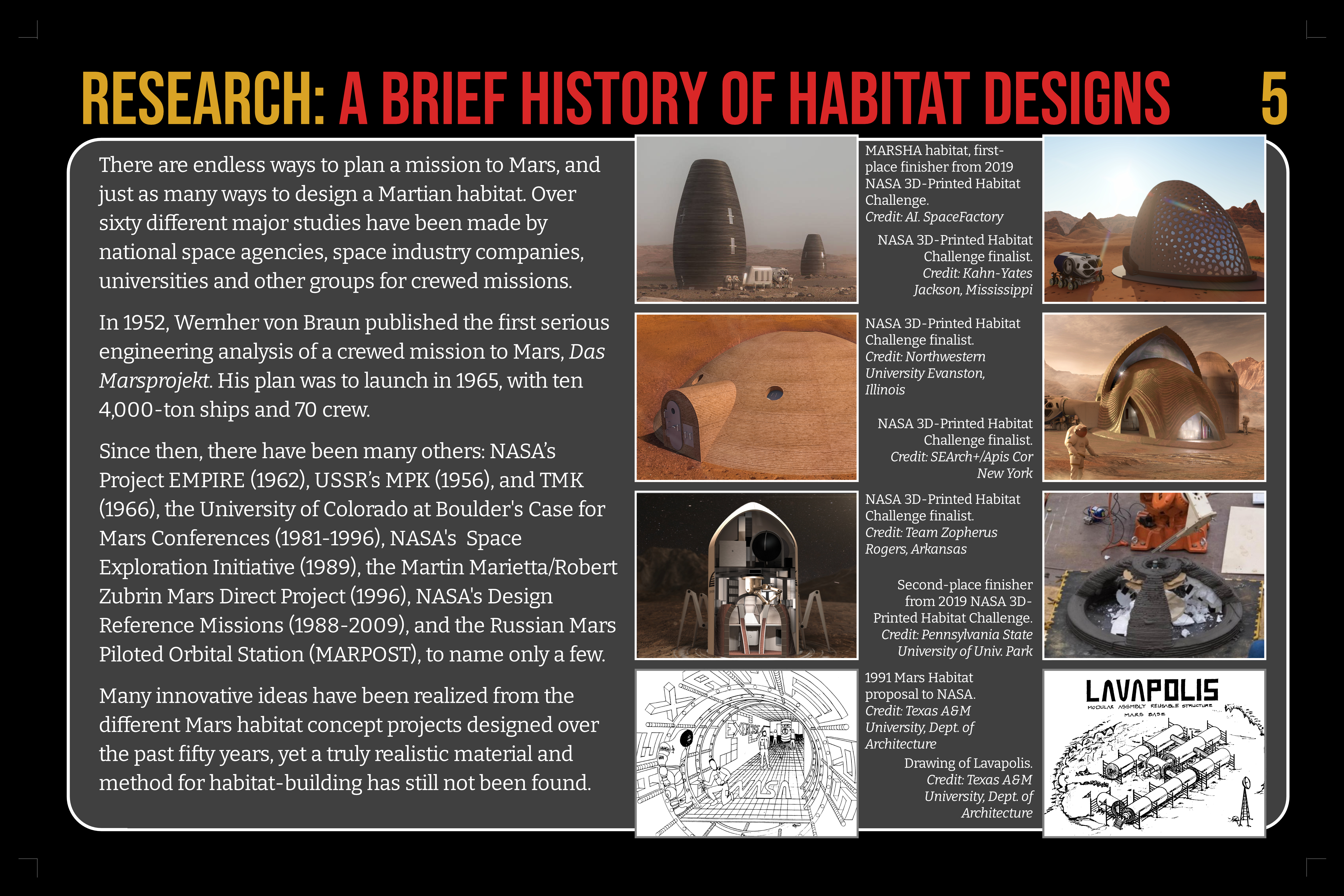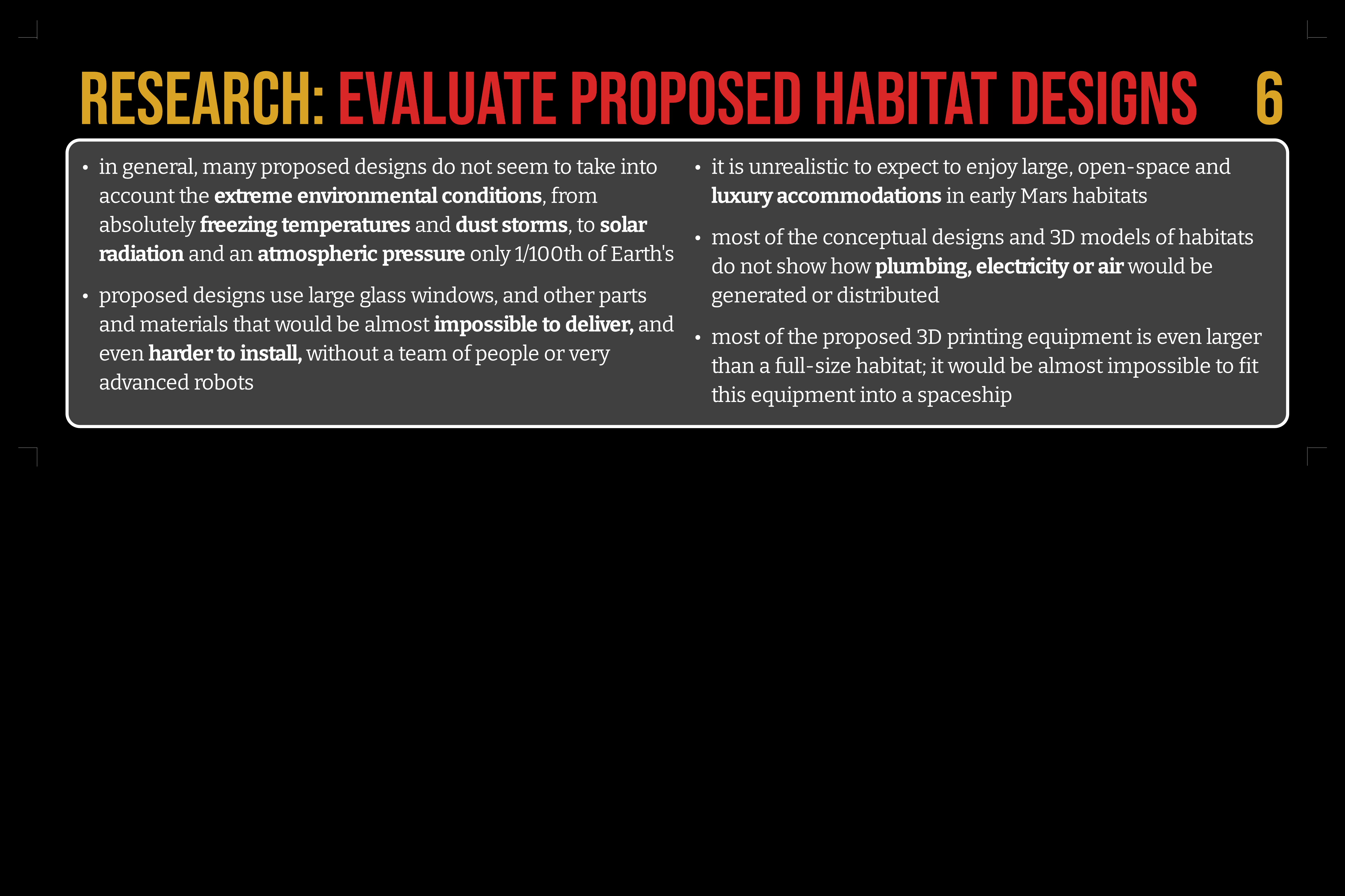 I was really interested in designing a Martian habitat that could actually be built on Mars, and that would be a practical place to work and live. One of the things that I immediately realized was that the only way to design a truly practical habitat would be to understand the biggest engineering challenges that would be faced. Some of these included: