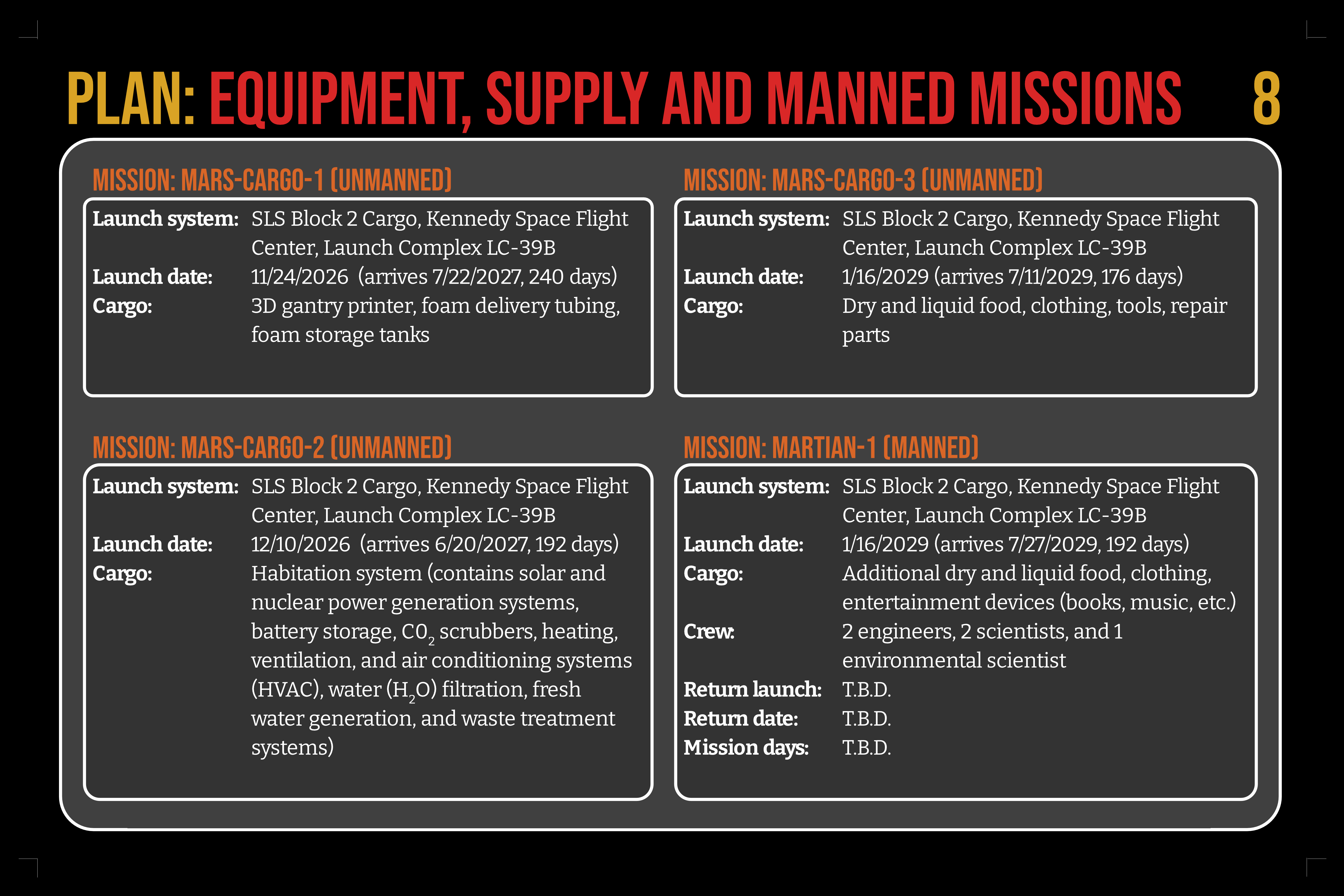 With all of the materials chosen and the design completed, building my habitat on Mars only requires figuring out when to send each load of materials, before humans make the trip to their new home. There are very limited windows of time where Earth and Mars are closely aligned for a quick, seven-month trip. According to NASA's online trajectory tools, there are flight windows available in 2024, 26, 28 and 29. By my calculations, we can send two equipment flights in 2026, and then send supply and human flights in 2029 for a successful Mars mission.