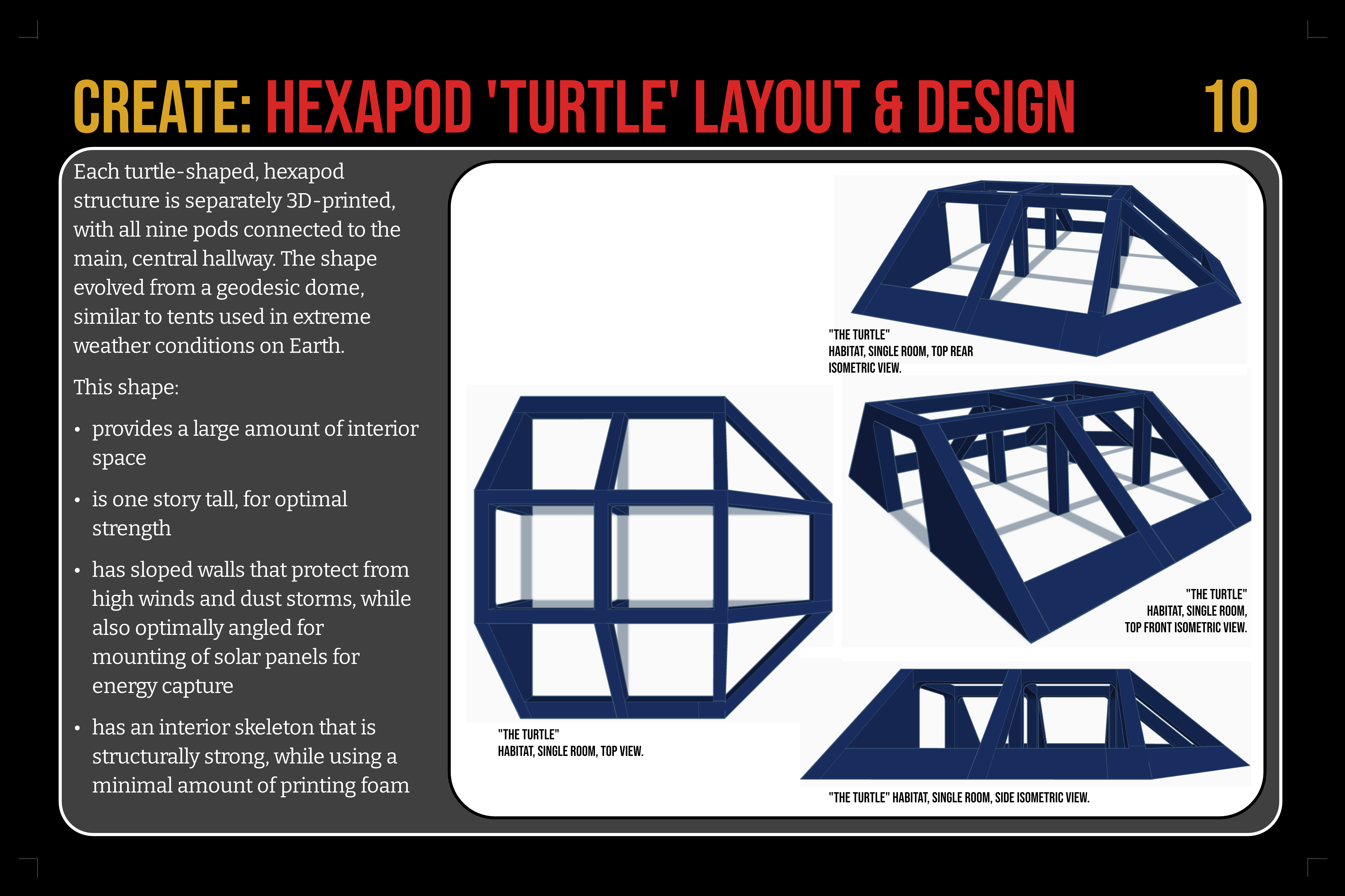 The final design is a six-sided, turtle-shaped structure that I obviously decided to call the Martian Turtle. This design keeps all of the benefits of the Elezering shape, while connecting to a shared corridor that brings life-sustaining services to each turtle.