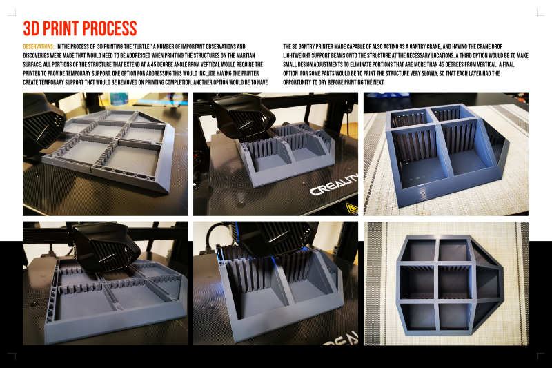 Understanding these requirements, I began to think about possible structural shapes and building materials because my choices would not only have to meet the needs of the inhabitants, but would also have to either be carried to Mars on a rocket, or built on the surface of the planet.